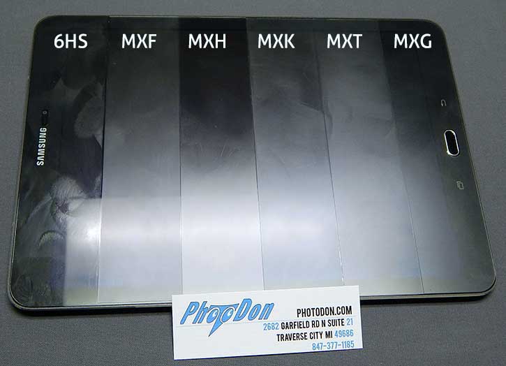 | MXH: Anti-Glare 25% (light matte finish.) Recommended for glass-front monitors, cell phones, tablets and other mobile or stylus devices. Cons: Noticeable surface reflection in bright light. |